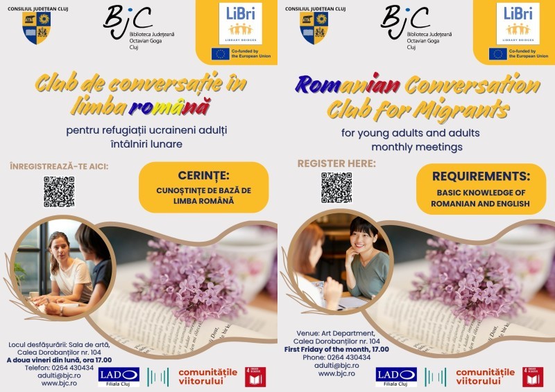 Biblioteca Județeană „Octavian Goga” Cluj, Sala de artă Calea Dorobanților nr. 104, etajul V est, Cluj-NapocaBiblioteca Județeană „Octavian Goga” Cluj anunță organizarea unui Club de conversație în limba română pentru migranți și refugiați ucraineni, în perioada noiembrie 2025-aprilie 2026. Întâlnirile vor avea loc lunar, la sediul central al bibliotecii (Calea Dorobanților nr. 104, Sala de artă, etajul 5 est). Participanții la activități trebuie să cunoască…