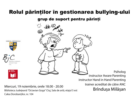 Biblioteca Județeană "Octavian Goga" Cluj Calea Dorobanților nr. 104, Cluj-Napoca, RomaniaA fi părinte e un lucru minunat, dar deloc ușor. Dorim să venim în sprijinul vostru, invitându-vă să participați la Grupul de Suport pentru Părinți. Dacă vă doriți să: împărtășiți bucuriile și reușitele dumneavoastră ca părinți fiți ascultați și înțeleși în dificultățile pe care le întâmpinați, păstrându-vă astfel propriul echilibru…