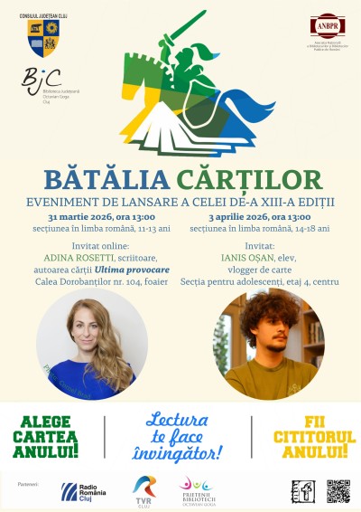 Biblioteca Județeană "Octavian Goga" Cluj Calea Dorobanților nr. 104, Cluj-Napoca, RomaniaBiblioteca Judeţeană „Octavian Goga” Cluj lansează cea de-a XIII-a ediţie a Concursului Naţional de Lectură „Bătălia Cărților”. Evenimentele de lansare vor avea loc astfel: - marți, 31 martie 2026, ora 13:00, lansarea concursului pentru copii, secțiunea în limba română, ce o are ca invitată online pe Adina Rosetti, scriitoare, autoarea…