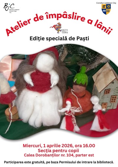 Biblioteca Județeană „Octavian Goga" Cluj, Secția pentru copii Calea Dorobanților nr. 104, parter est, Cluj-Napoca, RomaniaSecția pentru copii organizează miercuri, 1 aprilie 2026, de la ora 16.00, un nou atelier de împâslire a lânii, adresat copiilor cu vârste cuprinse între 9 și 14 ani. Participarea este gratuită, pe baza Permisului de intrare la bibliotecă. Informații suplimentare și înscrieri: Secția pentru copii, Calea Dorobanților nr. 104,…