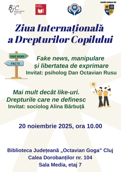 În cadrul parteneriatului încheiat între Biblioteca Județeană „Octavian Goga” Cluj și Fundația UBB „Alma Mater Napocensis”, Secția pentru adolescenți celebrează Ziua Internațională a Drepturilor Copilului prin două activități intitulate: „Mai mult decât like-uri. Drepturile care ne definesc” și „Fake news, manipulare și libertatea de exprimare”. Evenimentul va fi susținut de…