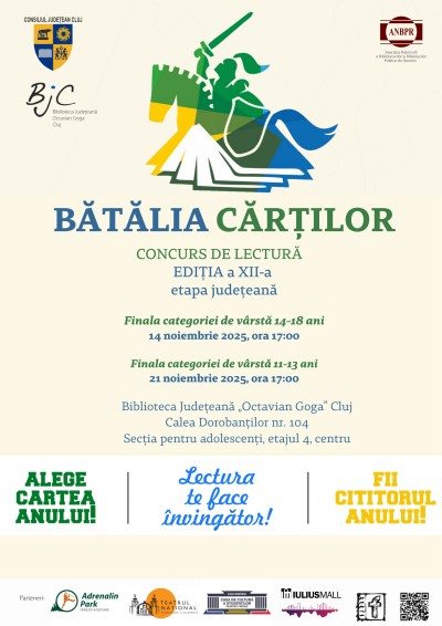 Biblioteca Judeţeană „Octavian Goga” Cluj organizează Finala Județeană a Concursului de Lectură „Bătălia Cărţilor”, ediția a XII-a. Aceasta va avea loc, după cum urmează: în 14 noiembrie 2025, de la ora 17.00, va avea loc finala pentru adolescenți și în 21 noiembrie 2025, de la aceeași oră, va avea loc…