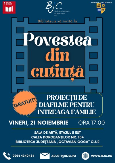 Vă așteptăm la o nouă întâlnire cu „Povestea din cutiuță" 📽️ - program pentru întreaga familie! Dragi bunici, părinți și copii, vă invităm cu mare drag în data de 21 noiembrie, ora 17:00, la Biblioteca Județeană „Octavian Goga” Cluj, Sala de artă, Etaj V, Tronson Est pentru un eveniment inedit!…