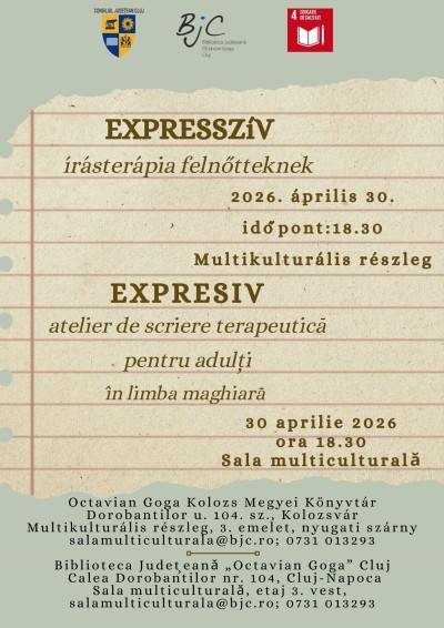 Atelierul de scriere terapeutică în limba maghiară „Expresiv” este un atelier practic și interactiv destinat adulților, care îmbină tehnici de dezvoltare personală cu scrierea creativă în scop terapeutic. Întâlnirile cu frecvență lunară se desfășoară sub coordonarea doamnei dr. Mikola Emese, specialist în scriere terapeutică. Atelierul din 30 aprilie va avea loc de la ora 18.30 la Sala multiculturală, etaj 3 vest. Participarea este gratuită în baza permisului de bibliotecă. Persoanele interesate se pot înscrie la adresa de email salamulticulturala[at]bjc.ro sau la nr. de telefon 0731 013293.