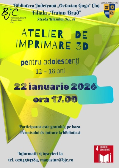 Filiala „Traian Brad” a Bibliotecii Județene „Octavian Goga” Cluj organizează, începând cu 22 ianuarie 2026, un atelier de imprimare 3D pentru adolescenți. Activitățile vor avea loc în fiecare zi de joi, de la ora 17.00, pe parcursul a patru săptămâni. Participarea este gratuită, pe baza Permisului de intrare la bibliotecă. Înscrieri și informații suplimentare la telefon 0264-565784 sau e-mail manastur[at]bjc.ro. Vă așteptăm!