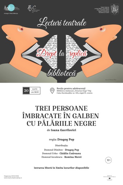 Vineri, 20 martie 2026, de la ora 18.00, clujenii sunt invitați la Biblioteca Județeană „Octavian Goga” Cluj, Secția pentru adolescenți, Calea Dorobanților nr. 104, etajul IV, centru, unde va avea loc un nou spectacol-lectură organizat de Teatrul Național „Lucian Blaga” Cluj-Napoca sub genericul „Drept la replică. Lecturi teatrale la bibliotecă”. Actorii Naționalului clujean vor da voce personajelor din piesa „Trei persoane îmbrăcate în galben cu pălăriile negre” de Ioana Gavrilovici, un text care ne invită să reflectăm la natura dezumanizantă a unei dictaturi polițienești. Spectacolul-lectură este regizat de Dragoș Pop, avându-i în distribuție pe Dragoș Pop, Cătălin Codreanu și Romina Merei.