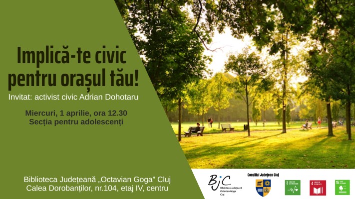 Biblioteca Județeană „Octavian Goga” Cluj invită tinerii miercuri, 1 aprilie 2026, ora 12.30, la activitatea „Implică-te civic pentru orașul tău!”, care îl va avea ca invitat pe activistul civic Adrian Dohotaru, președintele asociației „Societatea Organizată Sustenabil”, militant pentru dreptate socială și locativă și pasionat de spațiile publice verzi și arii naturale urbane protejate.