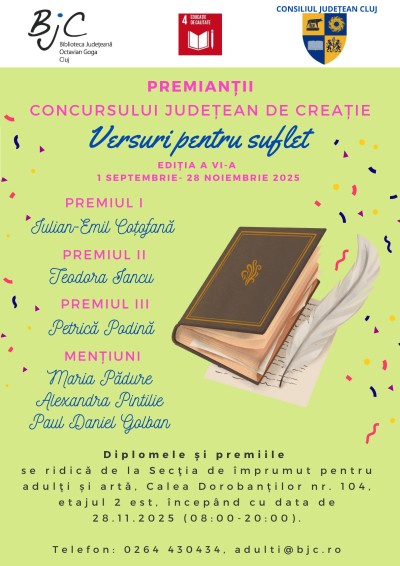 Câștigătorii sunt invitați să își ridice diplomele și premiile începând cu 28 noiembrie 2025, de la Secția de împrumut pentru adulți și artă, etajul 2 est, Calea Dorobanților nr. 104, între orele 08:00-20:00.