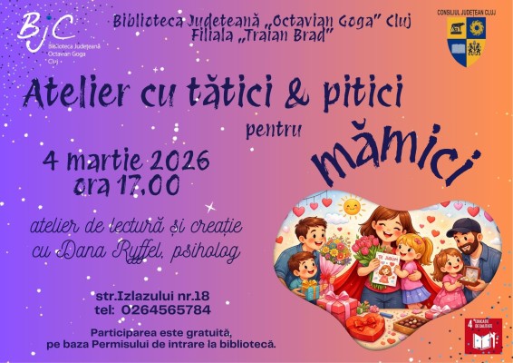 Filiala „Traian Brad” a Bibliotecii Județene „Octavian Goga” Cluj organizează un atelier de lectură și creație altfel, alături de Dana cu povești – un moment special pregătit pentru Ziua Mamei. Activitatea va avea loc miercuri, 4 martie 2026, ora 17.00. Participarea este gratuită, pe baza Permisului de intrare la bibliotecă. Informații suplimentare la telefon 0264-565784 sau e-mail manastur[at]bjc.ro.