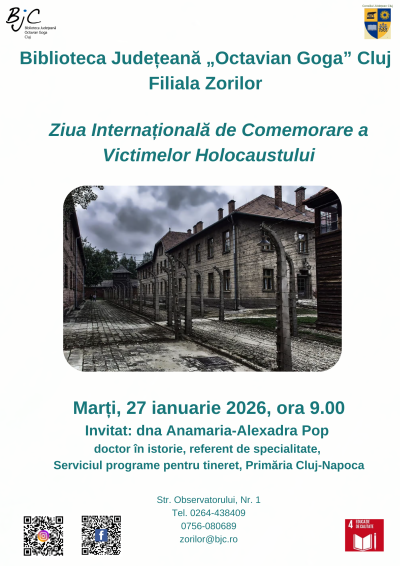 Cu ocazia Zilei Internaționale de Comemorare a Victimelor Holocaustului, Filiala Zorilor a Bibliotecii Județene „Octavian Goga” Cluj organizează marți, 27 ianuarie 2026, ora 9.00, o activitate dedicată acestui eveniment. Invitat al întâlnirii este doamna Anamaria-Alexadra Pop, doctor în istorie, referent de specialitate, Serviciul programe pentru tineret, Primăria Cluj-Napoca. Participă elevii…
